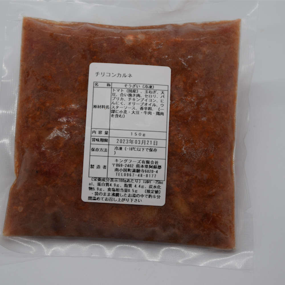 原材料名:トマト(国産)、玉ねぎ、大豆、合い挽き肉、セロリ、パプリカ、チキンブイヨン、ニンニク、オリーブオイル、ウスターソース、香辛料